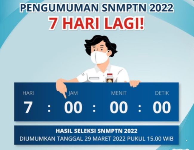"Tujuh hari lagi hasil SNMPTN 2022 akan diumumkan. Pengumuman dapat diakses pada 29 Maret 2022 mulai pukul 15.00 WIB," tulis LTMPT dalam akun Instagram ltmptofficial yang dikutip detikcom pada Rabu (23/3/2022).