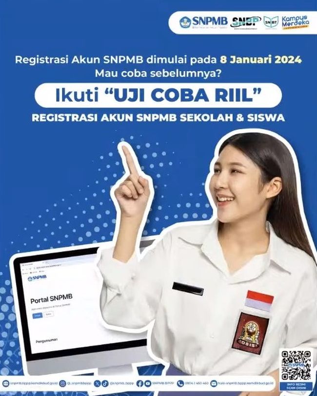 Panitia Seleksi Nasional Penerimaan Mahasiswa Baru (SNPMB) akan mengadakan uji coba registrasi akun SNPMB pada 6 Januari 2024 pukul 15.00 WIB. Uji coba ini dapat diakses pada Portal SNPMB melalui https://snpmb.bppp.kemdikbud.go.id/