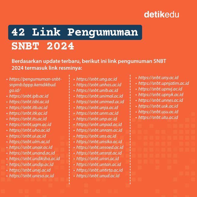 Jangan lupa pengumuman UTBK SNBT 2024 akan dilaksanakan pukul 15.00 WIB hari ini melalui tautan https://snpmb.bppp.kemdikbud.go.id/utbk-snbt/pengumuman-snbt dan 41 link perguruan tinggi negeri (PTN) mirror lainnya. Semoga berhasil masuk PTN impianmu detikers!