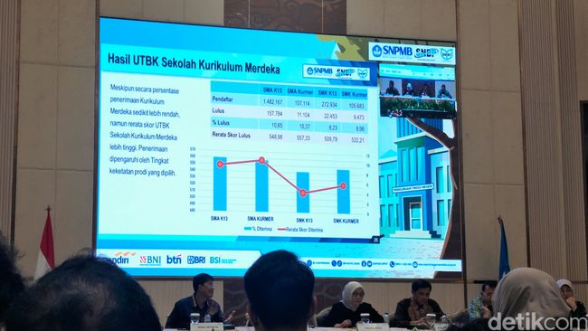 Rerata skor UTBK 2024 siswa dari sekolah yang menerapkan Kurikulum Merdeka lebih tinggi dibandingkan dengan siswa dengan kurikulum lain. Ketua Tim Penanggung Jawab SNPMB 2024, Prof Ganefri merinci rerata skor UTBK 2024 siswa SMA Kurikulum Merdeka sebesar 557,33. Sedangkan skor UTBK siswa SMA Kurikulum 2013 sebesar 548,98.