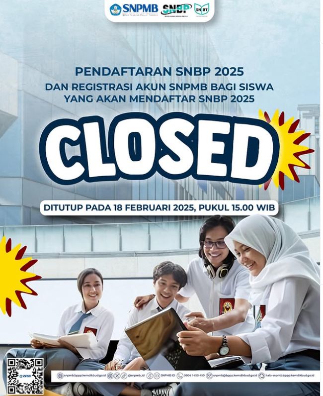 Pendaftaran SNBP 2025 dan registrasi akun SNPMB ditutup per pukul 15:00 WIB. Pengumuman ini telah disampaikan pihak SNPMB kepada calon mahasiswa pada Selasa (18/2/2025) pagi.
