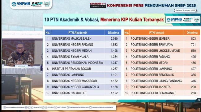 Pengumuman hasil Seleksi Nasional Berdasarkan Prestasi (SNBP) dilaksanakan pada hari ini Selasa (18/3/2025). Selain itu, panitia mengabarkan perguruan tinggi negeri (PTN) dengan penerima Kartu Indonesia Pintar (KIP) Kuliah 2025 terbanyak.