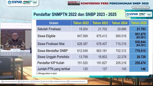 Ketua Umum Tim Penanggung Jawab Seleksi Nasional Penerimaan Mahasiswa Baru (SNPMB) Prof Eduart Wolok menjelaskan alasan mengapa ada lebih dari 150.000 siswa tak daftar Seleksi Nasional Berdasarkan Prestasi (SNBP) 2025 meski sudah melakukan finalisasi nilai.