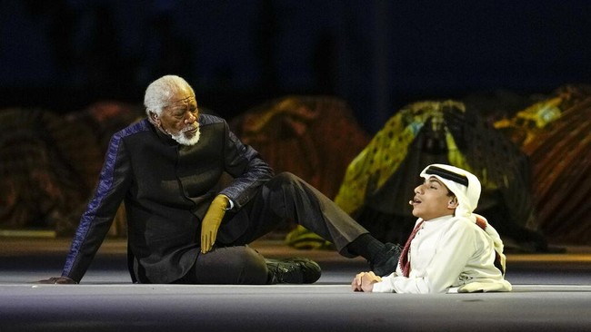 Pada saat upacara pembukaan Piala Dunia 2022, Ghanim membacakan surat Al Hujurat ayat 13 yang menyoroti tentang kesetaraan derajat manusia di mata Allah SWT. Ia didampingi aktor asal Amerika Serikat Morgan Freeman yang membacakan versi terjemahannya. (AP Photo/Natacha Pisarenko)