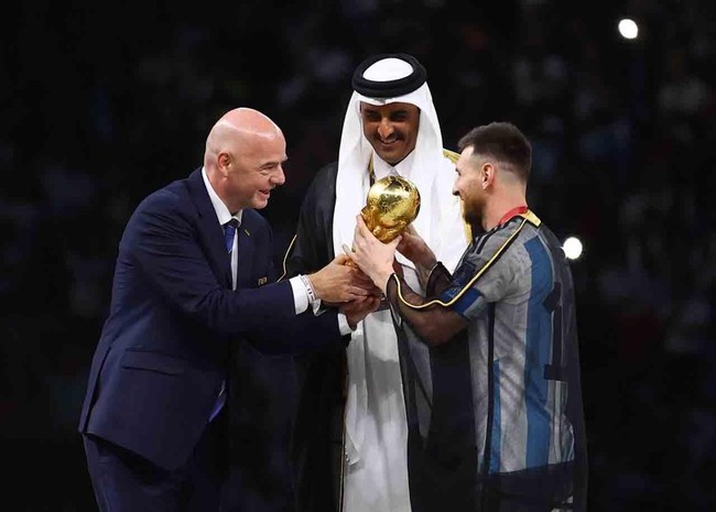 Ada pemandangan menarik saat momen penyerahan trofi Piala Dunia 2022, di Lusail Stadium, Qatar pada Minggu (18/12/2022). Emir Qatar Sheikh Tamim bin Hamad Al Thani dan Presiden FIFA Gianni Infantino menyerahkan tropi Piala Dunia 2022 kepada Bintang Argentina Lionel Messi Foto: Reuters