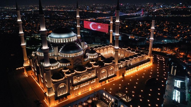 Turki - Umat Islam berkumpul di Masjid Agung Camlica untuk memperingati Laylat al-Raghaib. Masjid ini pun bersinar dengan indah.