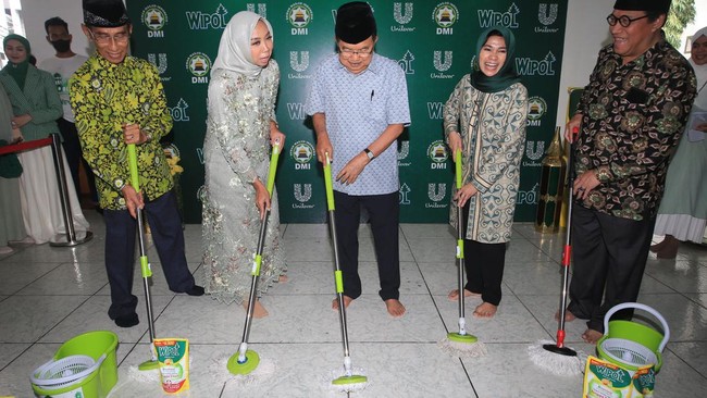 (Ki-Ka) Drs H Andi Mappaganty, MM, Ketua Pimpinan Pusat Dewan Masjid Indonesia Bidang Sosial dan Kemanusiaan; Anggya Kumala, Head of Home & Hygiene Unilever Indonesia; Dr. (H.C.) Drs. H. Muhammad Jusuf Kalla, Ketua Umum Pimpinan Pusat Dewan Masjid Indonesia; Nurdiana Darus, Corporate Secretary and Director of Sustainability & Corporate Affairs Unilever Indonesia; Dr. H. Imam Addaruqutni, MA, Sekretaris Jenderal Pimpinan Pusat Dewan Masjid Indonesia melakukan sesi seremoni bersih masjid dalam rangkaian kegiatan peluncuran Gerakan Masjid Bersih 2023.