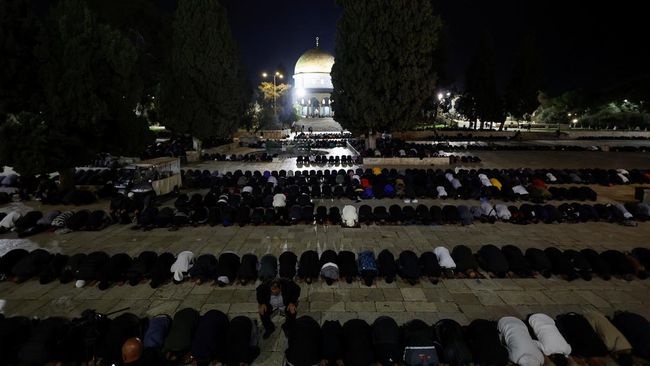 Palestina - Warga muslim Palestina melakukan salat tarawih di Masjid Al-Aqsa. Salat berlangsung khusyuk di masjid suci ketiga umat Islam tersebut.