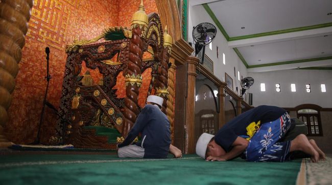 Sejumlah anak melaksanakan salat dzuhur berjamaah di Masjid Syekh Maulana Malik Ibrahim, Desa Leran, Gresik, Jawa Timur (28/3/2023).