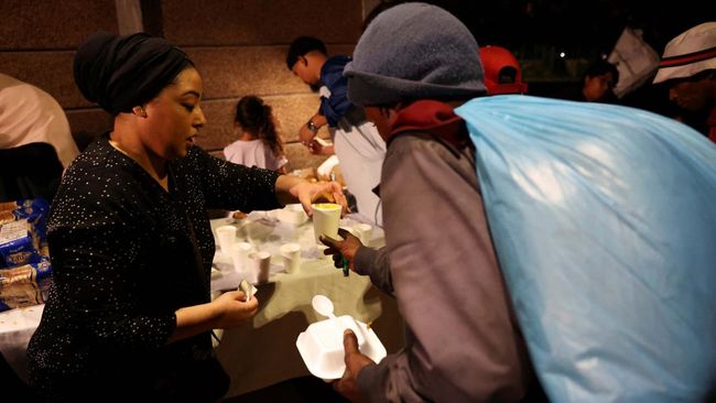 Seorang relawan membagikan makanan saat berbuka puasa selama bulan suci Ramadan di Cape Town, Afrika Selatan, 6 April 2023.