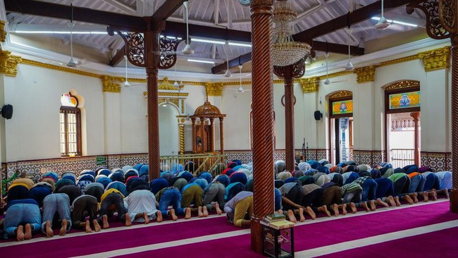 Para umat muslim melaksanakan sholat di masjid merah di Kolombo, Sri Lanka, Rabu (5/4/2023). Masjid Merah Kolombo, juga dikenal sebagai Masjid Jami Ul-Alfar.