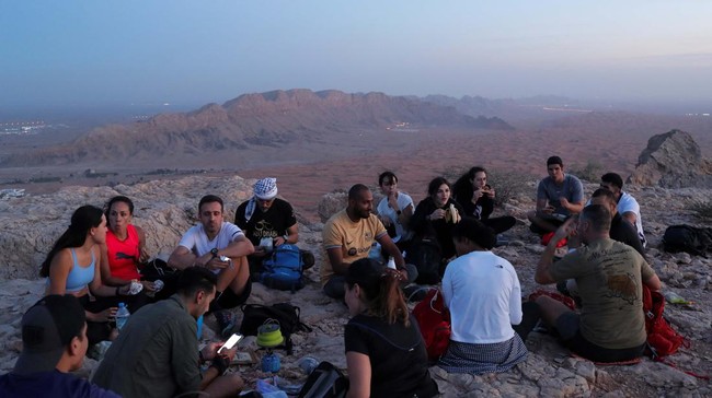 Sharjah - Sejumlah pemuda mendaki kawasan Fossil Rock Nature Reserve di Sharjah, Uni Emirat Arab, 15 April 2023. Mereka naik ke bukit demi berbuka puasa di atasnya.