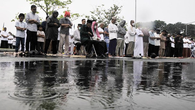 Jakarta - Hujan tidak menyurutkan niat umat Islam untuk melaksanakan Salat Idul Fitri tadi pagi. Warga tetap khusyuk menunaikan salat di tengah guyuran hujan.
