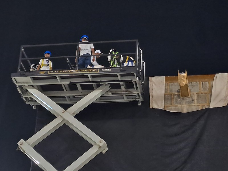 Tampak tangga hidrolik dengan beberapa pekerja melakukan penggantian kiswah. (Foto: Wahyu Putro Arinto/Media Center Haji [MCH] 2023)