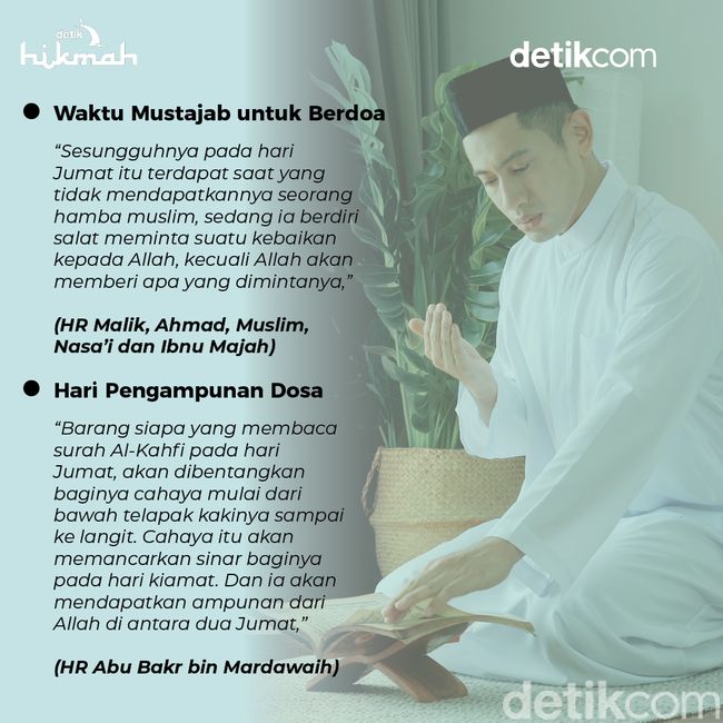 Banyak keutamaan yang bisa diraih di hari Jumat. Salah satunya yaitu tergolong sebagai waktu mustajab untuk berdoa kepada Allah SWT. Pada hari Jumat juga momen dibebaskannya orang-orang dari siksa neraka. Foto: detikHikmah