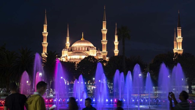 Turis dan penduduk setempat melihat air mancur bercahaya berlatar Sultan Ahmed atau Masjid Biru era Ottoman di Istanbul, Turki, Selasa (8/8/2023).