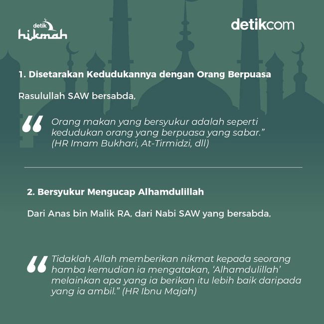 Jakarta - Sebagai seorang hamba Allah, sudah sepatutnya kita bersyukur atas segala nikmat. Ungkapan syukur dapat menjauhkan seseorang dari sifat takabur atau sombong.