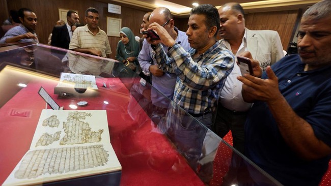 Pengunjung mengambil foto salinan Al-Qur'an langka yang telah dipulihkan di Perpustakaan dan Arsip Nasional, di Kairo, Mesir. Mesir telah memulihkan salinan Al-Qur'an yang langka, yang menurut para ahli sama tuanya dengan agama Islam itu sendiri.