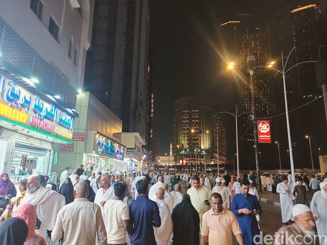 Jemaah berbondong-bondong menuju Masjidil Haram untuk melaksanakan salat Isya dan Tarawih pertama pada 2024. Tim detikHikmah dan jemaah Jennaira Group yang menginap di kawasan Misfallah berjarak 500-an meter dari Masjidil Haram pun ikut bergegas. (Foto: Afif Farhan/detikcom)