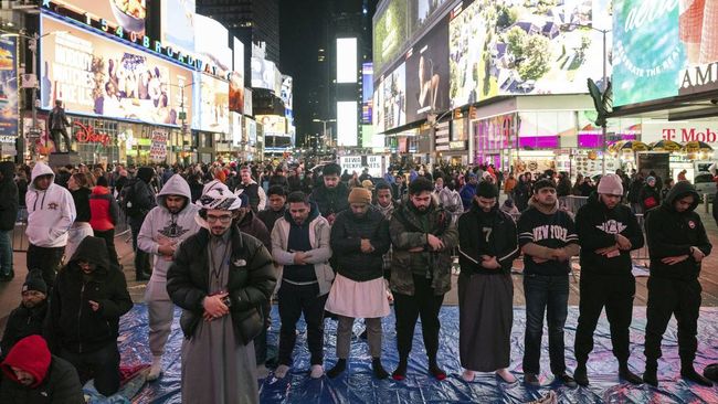 New York - Puluhan warga Muslim berkumpul di area Times Square, New York, Amerika Serikat (AS), untuk menjalankan salat tarawih. Begini momennya.