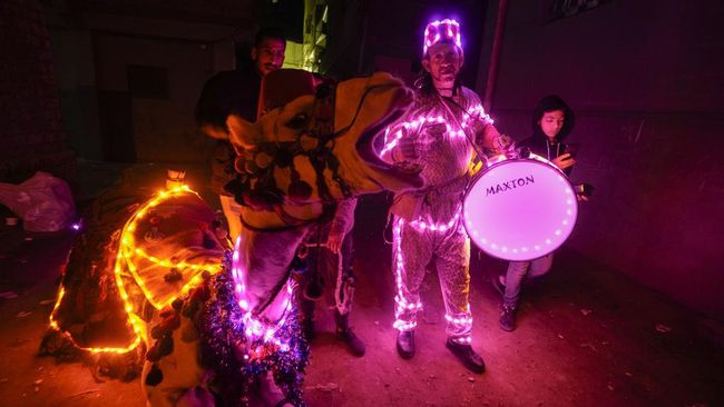 Mesir - Seorang pria di Mesir memiliki cara unik untuk membangunkan warga sahur. Ia berkeliling permukiman dengan lampu led berwarna pink menyelimuti tubuhnya.