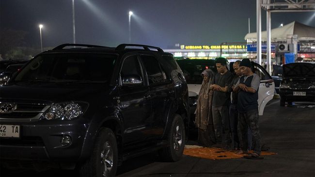 Jakarta - Sebagian pemudik melaksanakan salat Subuh di pinggir tol kawasan GT Cikampek Utama. Hal itu karena rest area terdekat sudah penuh pemudik yang beristirahat.