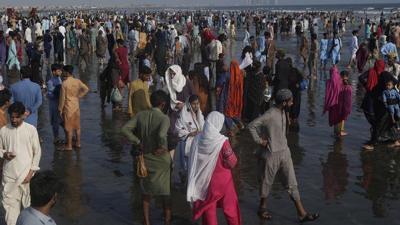 Sejumlah warga berjalan dan berkumpul di tepi pantai Clifton untuk merayakan hari raya Idul Fitri.