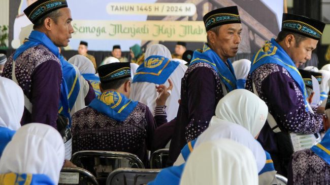 Jemaah haji mengikuti acara pemberangkatan ke asrama haji Surabaya di Pendopo Delta Wibawa Sidoarjo, Jawa Timur, Minggu (26/5/2024).