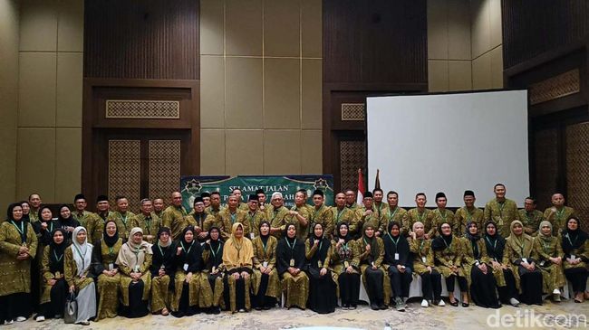 Jakarta - Sekitar 60 calon jemaah haji Paket Al-Fath Maktour menuju Madinah, Arab Saudi, Senin (27/5/2024). Mereka dilepas Nadhif Kasyvilla di Hotel Sultan, Jakarta.