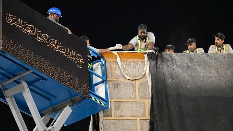 Kiswa baru dipasang dengan presisi dan kehati-hatian, menandai tradisi tahunan yang dilakukan setiap 1 Muharram dalam kalender Hijriah. REUTERS/SAUDI PRESS AGENCY