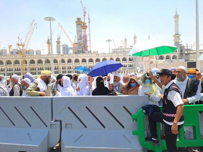 Jemaah yang keluar dari Masjidil Haram terpaksa harus menggunakan alat sekenanya untuk melindungi kepala dari sengatan panas matahari. Ada yang membawa payung, tas, sajadah atau kain surbannya untuk menutupi kepala.