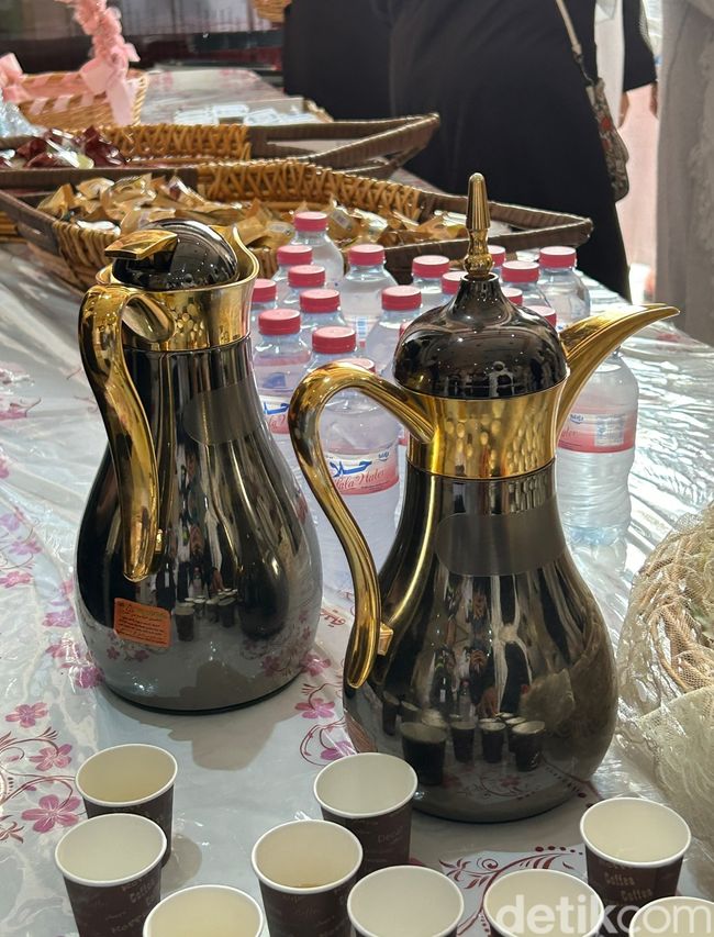Saat kedatangan gelombang I terakhir dari Madinah, Jumat (17/6/2023), ada yang menarik perhatian. Teko di atas meja penyambutan yang berisikopi ala Arab yang disebut qahwa. Apa itu?