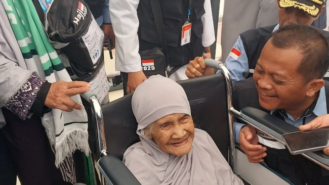 Mbah Sumbuk yang merupakan jemaah tertua asal Indonesia usia 109 tahun tiba di Jeddah Arab Saudi pada Minggu (18/5/2025). Matanya berkaca-kaca dan bibirnya bergetar sembari mengucap syukur dengan suara pelan, "Alhamdulillah ... Mbah tekan kene..."