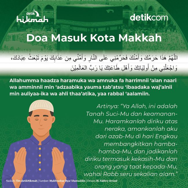 Jakarta - Membaca doa masuk Kota Makkah hukumnya sunnah. Simak bacaannya dalam infografis berikut.