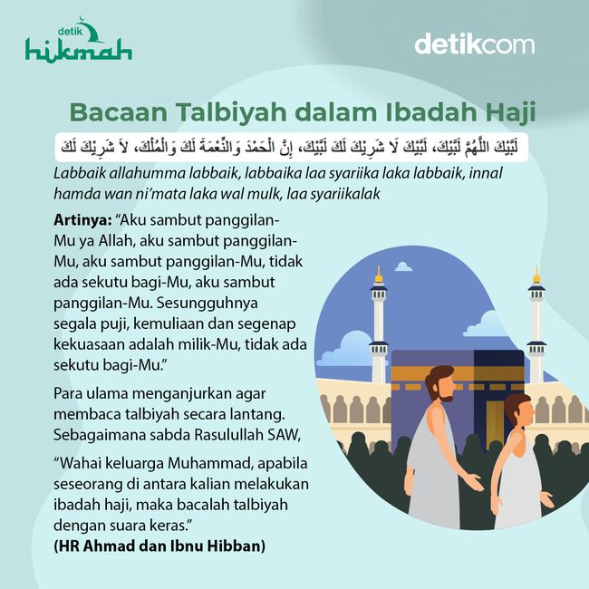 Jakarta - Jemaah haji dianjurkan mengucapkan bacaan talbiyah setelah melakukan niat ihram. Simak bacaannya dalam infografis berikut.