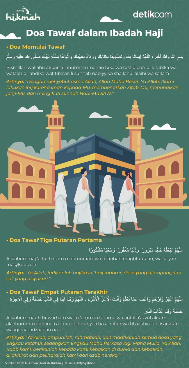 Jakarta - Tawaf adalah rukun haji yang dilakukan dengan mengelilingi Ka'bah sebanyak tujuh putaran. Sunnahnya jemaah bisa membaca doa tawaf untuk setiap putaran seperti disajikan dalam infografis berikut.