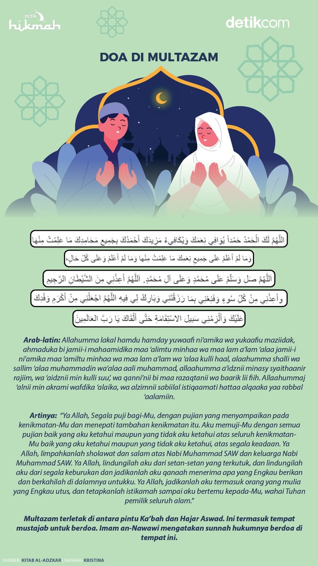 Jakarta - Multazam merupakan salah satu tempat di Baitullah yang mustajab untuk berdoa. Simak bacaan doa yang ma'tsur dibaca ketika di Multazam dalam infografis berikut!