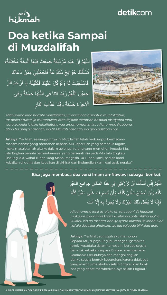 Jakarta - Muzdalifah adalah tempat yang terletak di dekat Mina dan Arafah. Lokasi ini dikenal sebagai tempat jemaah haji melakukan mabit (bermalam) dan mengumpulkan bebatuan untuk lontar jumrah di Mina. Dianjurkan membaca doa ketika sampai di Muzdalifah dengan bacaan seperti dalam infografis berikut!