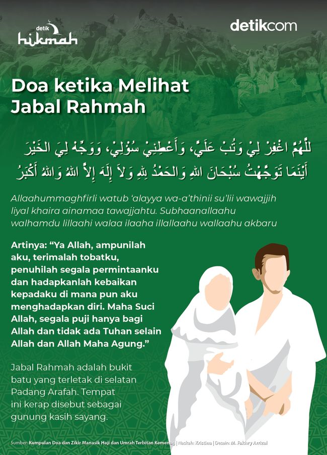 Jakarta - Jabal Rahmah adalah bukit batu yang terletak di selatan Padang Arafah dan kerap disebut gunung cinta atau kasih sayang. Umat Islam bisa membaca doa ketika melihat Jabal Rahmah. Simak bacaan doanya dalam infografis berikut!