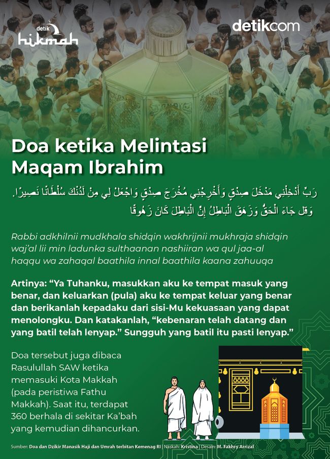 Jakarta - Maqam Ibrahim adalah batu pijakan yang digunakan Nabi Ibrahim AS saat membangun Ka'bah. Jemaah haji disunnahkan membaca doa ketika melintasi Maqam Ibrahim yang terletak di timur Ka'bah ini. Simak bacaan doanya dalam infografis berikut.