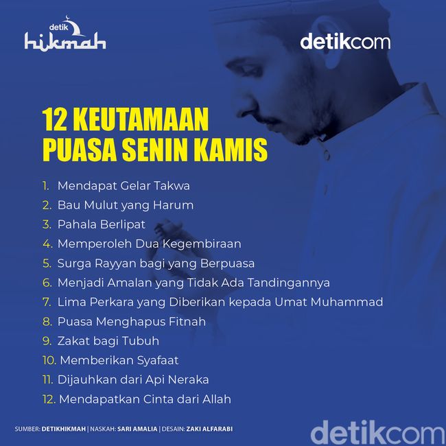 Infografis Hikmah Keutamaan Puasa Senin Kamis Devi Setya - detikHikmah Senin, 24 Jul 2023 08:02 WIB BAGIKAN Komentar Jakarta - Puasa Senin Kamis menjadi salah satu amalan yang rutin dikerjakan Rasulullah SAW. Banyak keutamaan yang bisa diraih dengan mengerjakan puasa sunnah ini. Simak Video "Video: Masih Ada Sisa Waktu, Ini Puasa Sunnah Menyambut Idul Adha!" (dvs/dvs) puasa sunnah puasa sunnah senin kamis infografis hikmah BAGIKAN Komentar