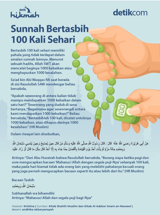 Jakarta - Bertasbih 100 kali sehari termasuk amalan sunnah dengan pahala besar. Simak bacaan dan keutamaannya dalam infografis berikut ini!