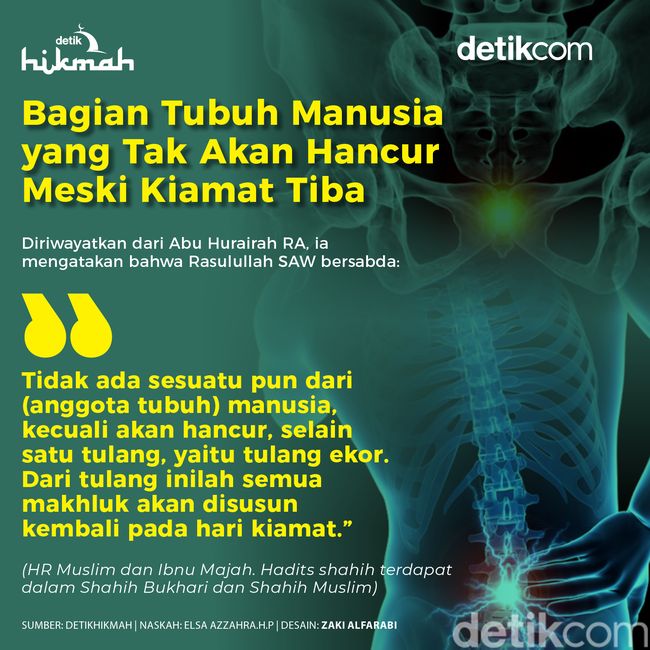 Jakarta - Termuat dalam kitab At Tadzkirah karya Imam Syamsuddin Al-Qurthubi yang bersandar pada hadits shahih dari Abu Hurairah RA. Bagian tubuh yang dimaksud adalah tulang ekor.