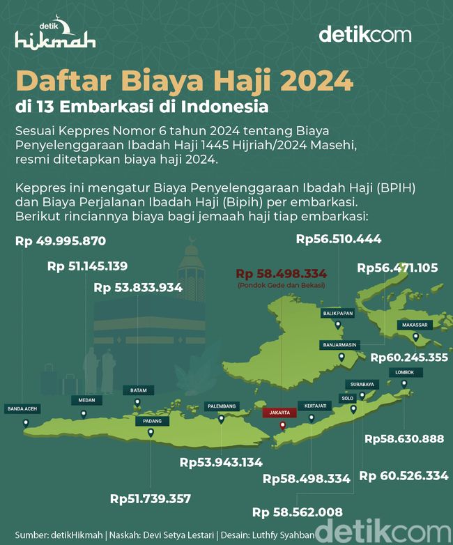 Jakarta - Daftar besaran biaya haji 2024 di 13 embarkasi di Indonesia telah resmi diterbitkan. Calon jemaah yang telah terdaftar sebagai jemaah haji 2024 harus tahu besaran biaya haji tiap embarkasi agar dapat segera melakukan pelunasan.