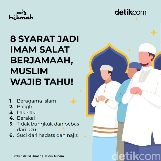 Jakarta - Dalam Islam, orang yang memimpin salat berjamaah disebut sebagai imam. Ada beberapa syarat yang harus dipenuhi bagi seseorang untuk memimpin salat berjamaah.