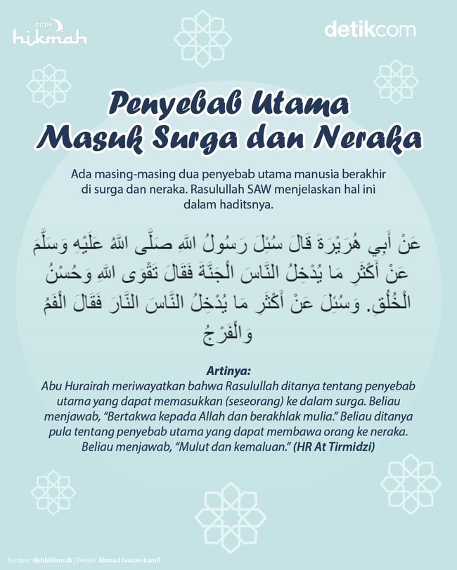Jakarta - Ada masing-masing dua penyebab utama manusia berakhir di surga dan neraka. Rasulullah SAW menjelaskan hal ini dalam haditsnya.