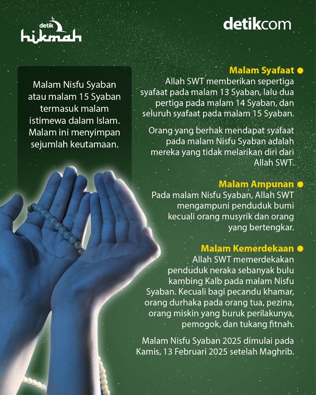 Jakarta - Malam Nisfu Syaban 1446 H bertepatan dengan Kamis, 13 Februari 2025 setelah Maghrib. Malam tersebut termasuk waktu istimewa dalam Islam. Imam al-Ghazali menjelaskan sejumlah keutamaan di dalamnya. Simak selengkapnya dalam infografis di atas!