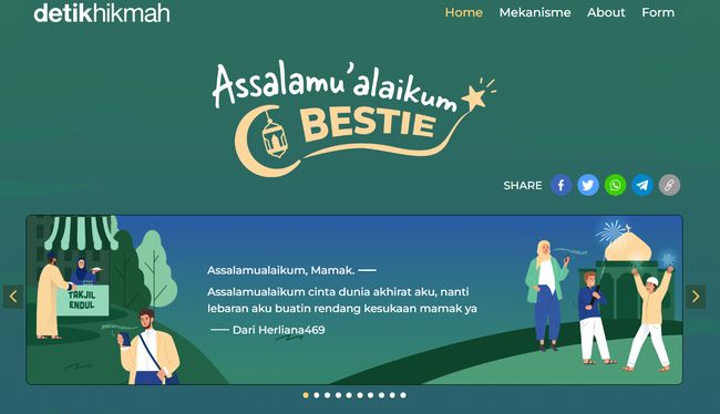 Untuk mengamalkan salah satu anjuran dari Rasulullah SAW tersebut, detikhikmah dan detikcom menyajikan program Assalamualaikum Bestie untuk detikers yang berniat mengirim salam hingga pesan pada kerabat. Salam yang dikirim akan ditayangkan secara serentak di beberapa medium mulai dari social media dan website dari detikcom dan detikHikmah, serta media lainnya yang bekerja sama dengan detikHikmah.