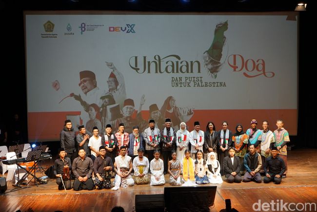 Kementerian Agama (Kemenag) Republik Indonesia semalam menggelar acara Untaian Doa dan Puisi untuk Palestina. Acara berlangsung di Gedung Usmar Ismail, Kuningan, Jakarta Selatan, Selasa (2/1/2024).