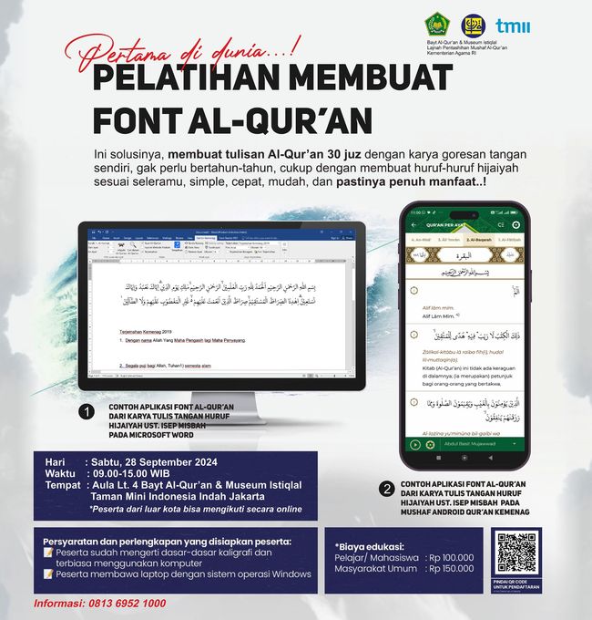 Pelatihan ini akan dilaksanakan pada 28 September 2024 dari jam 09.00 - 15.00 WIB, di Aula Lt. 4 Bayt Al-Qur'an & Museum Istiqlal (BQMI), Taman Mini Indonesia Indah, Jakarta. Para peserta dari luar kota juga bisa mengikuti kegiatan ini secara daring. Info lebih lanjut bisa menghubungi 081369521000.
